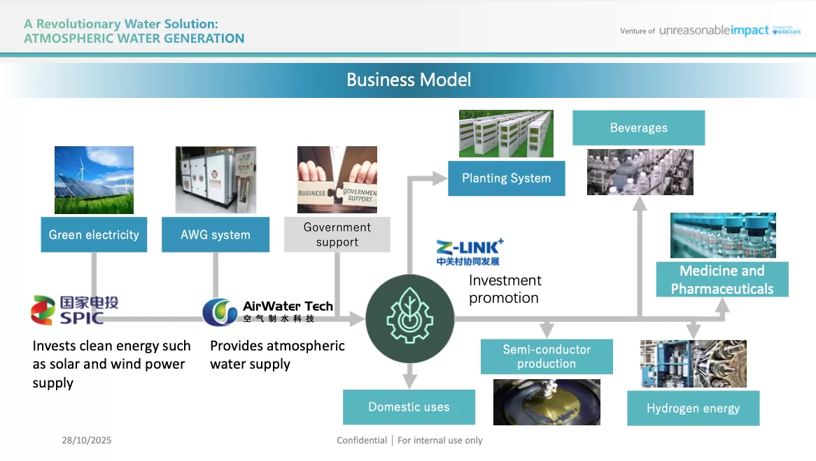 目前,空氣製水科技正在與國家電投、中關村協同發展投資有限公司、世貿聯合基金總會共同開發打造空氣水生態產業園,將結合空氣製水和新能源技術,提高常駐企業的可持續發展績效,包括通過促進工業共生和綠色技術,提高資源效率並產生競爭優勢,促進氣候適應型產業和綠色價值鏈等。