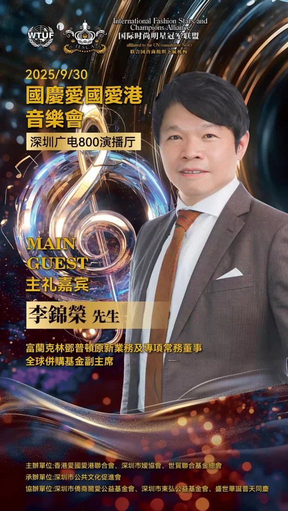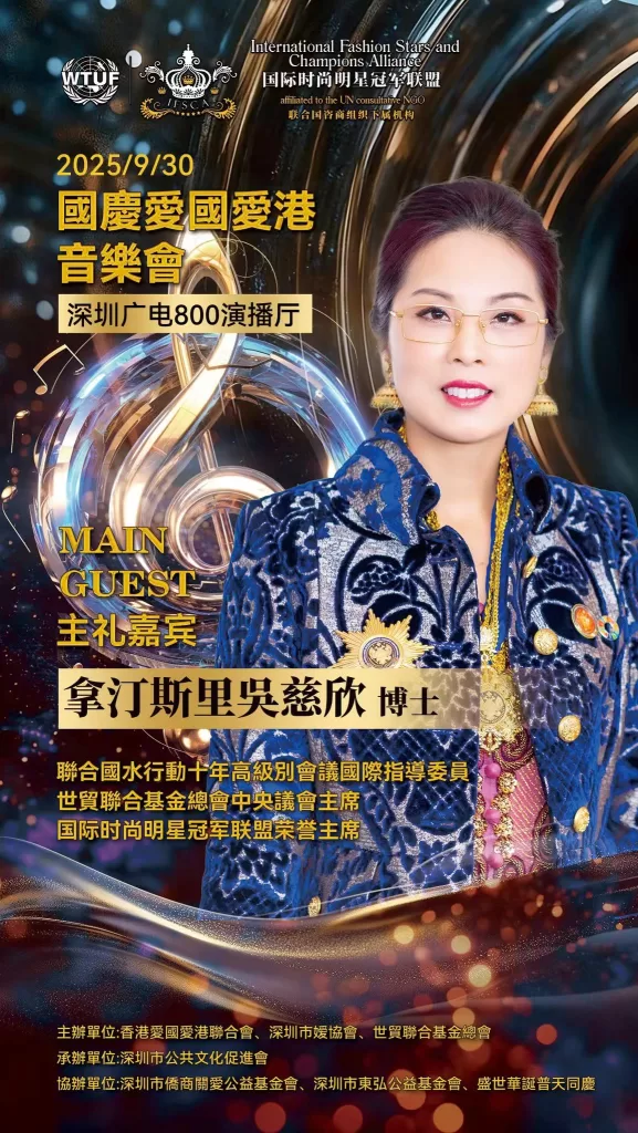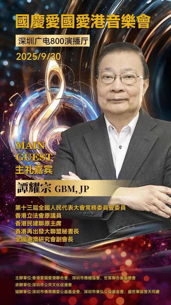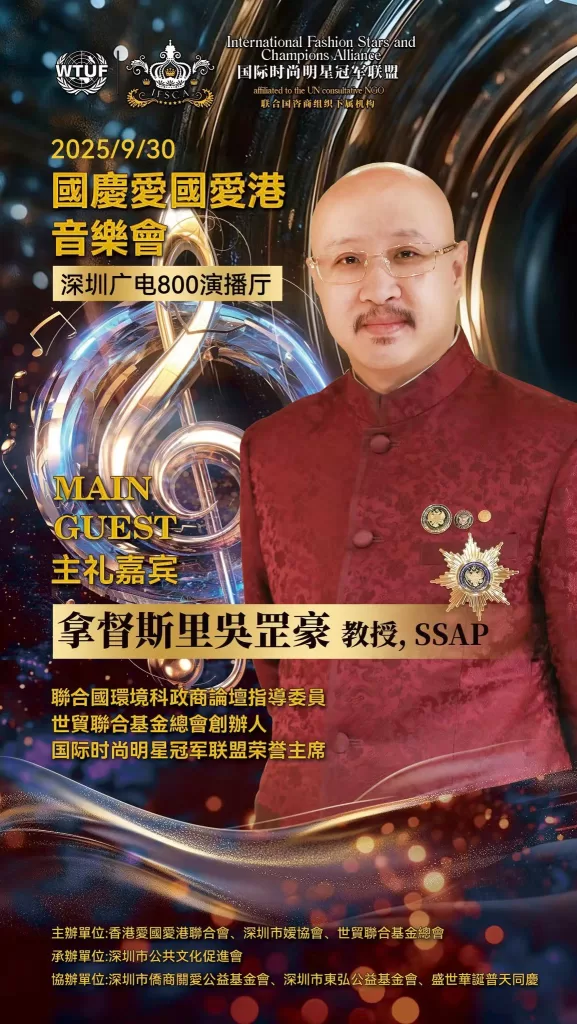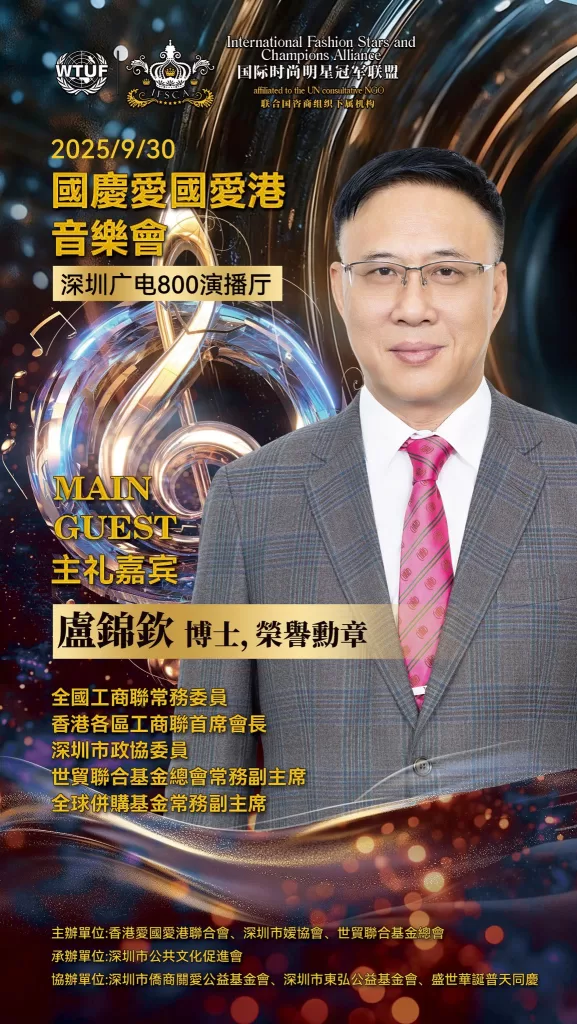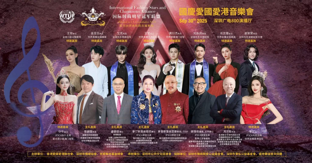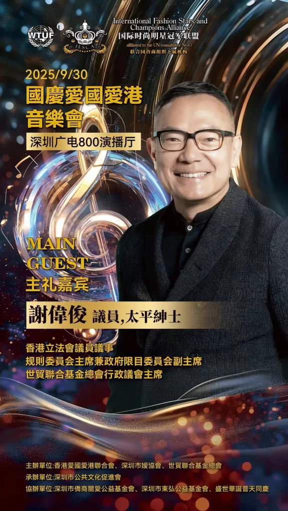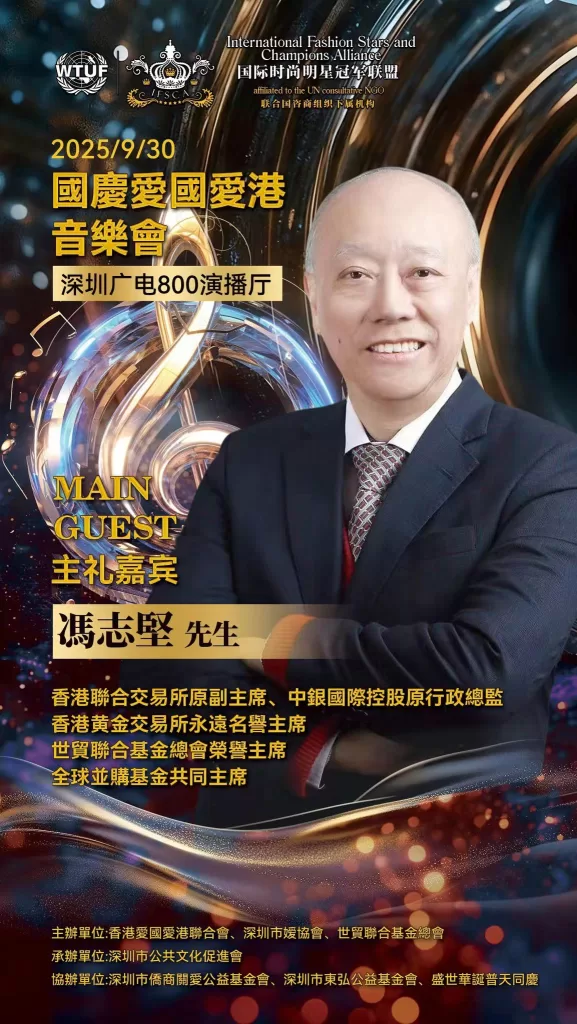 為深入貫徹落實愛國愛港精神、凝聚僑界力量,由深圳市僑媛協會、世貿聯合基金總會(聯合國諮商組織)、香港愛國愛港聯合會等組織合辦的“萬紫千紅頌中華”慶國慶·愛國愛港音樂會在深圳市電視台演播廳舉行圓滿。深圳市僑聯永遠榮譽主席、深圳市委統戰部原副部長、深圳市僑媛協會書記兼會長孔愛玲;世貿聯合基金總會創辦人拿督斯里吳罡豪教授 SSAP,中央議會主席拿汀斯里吳慈欣博士,行政議會主席、香港立法會議員兼議事規則委員會主席謝偉俊 JP,榮譽主席、香港立法會原議員、中銀國際控股原行政總監、香港黃金交易所永遠名譽主席馮志堅院士;愛國愛港聯合會會長高洋,榮譽會長程謙;全國人大代表蔡培輝等出席。