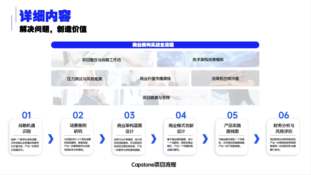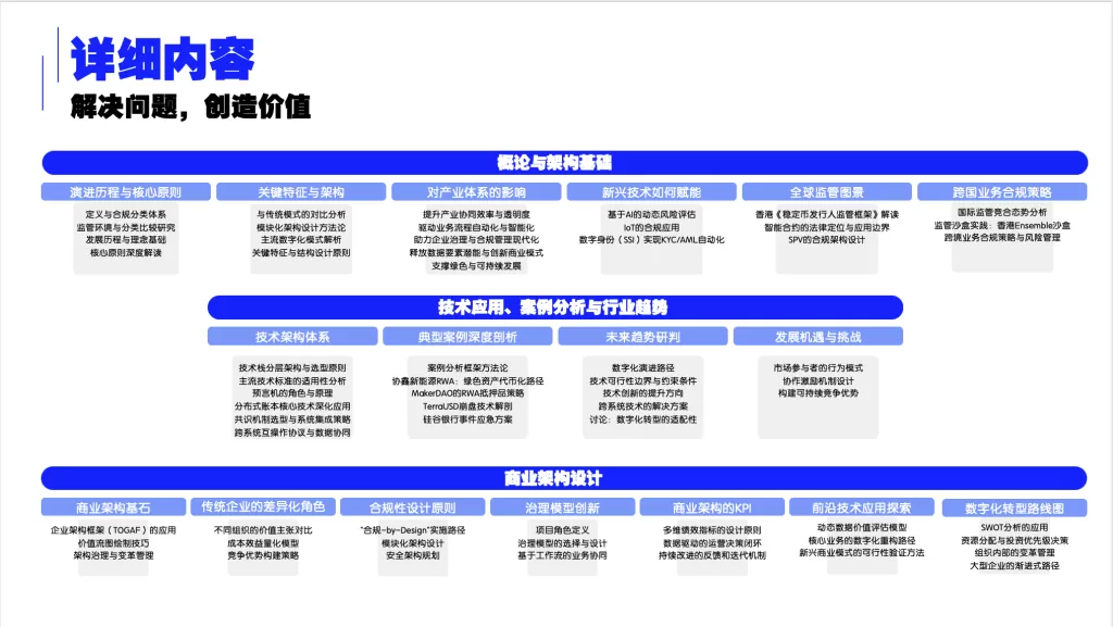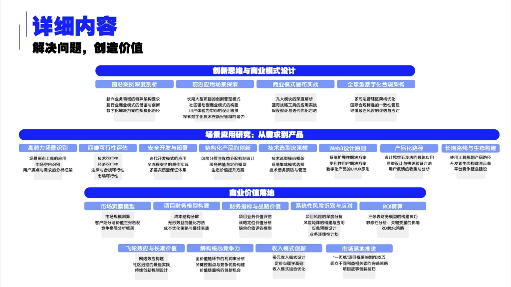 課程設置緊密結合產業發展需求,涵蓋等創新技術融合、商業架構設計、市場分析與風險評估以及數字化轉型等核心模塊。學員將通過理論學習與實戰案例相結合的方式,系統掌握RWA項目的全流程管理能力。