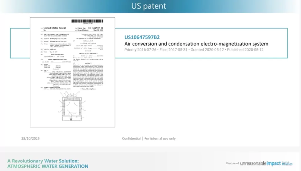 AirWater Tech USA Ltd 的技术体系建立在多项核心专利之上,其中量子半导体凝云系统、空气提纯冷凝技术和大气甘露转化系统构成了技术基石。特别值得关注的是,Dato’ Sri Prof. BALDUR Maximus 拥有的美国发明专利(有效期2020年至2040年)为其技术创新提供了长达20年的法律保障。