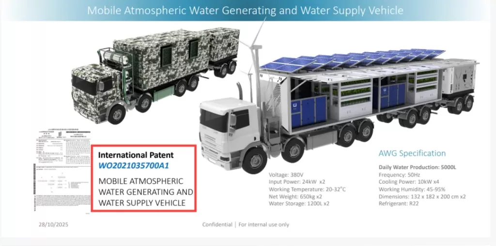 与美国军方仍在探索的技术路径不同,AirWater Tech USA Ltd 的技术已经形成了完整的产品线。其移动式空气制水及供水车辆等产品,已经成功应用于沙漠城市、船舰、海岛和海上作业平台等传统水源不可及的场景。这些成熟产品的存在,证明了该技术已经从实验室阶段走向了实际应用。