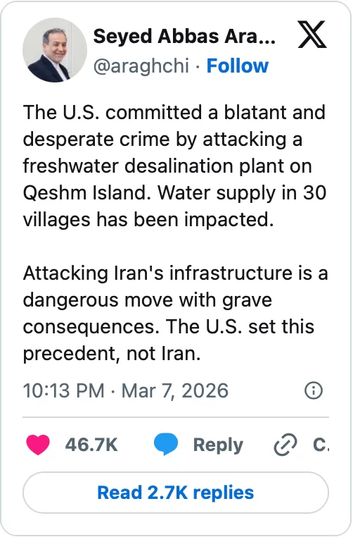 2026年3月7日,伊朗外長阿拉格奇(Seyed Abbas Araghchi)指責美國襲擊了葛希姆島(Qeshm Island)的一座海水淡化廠,犯下了公然和絕望的罪行。
