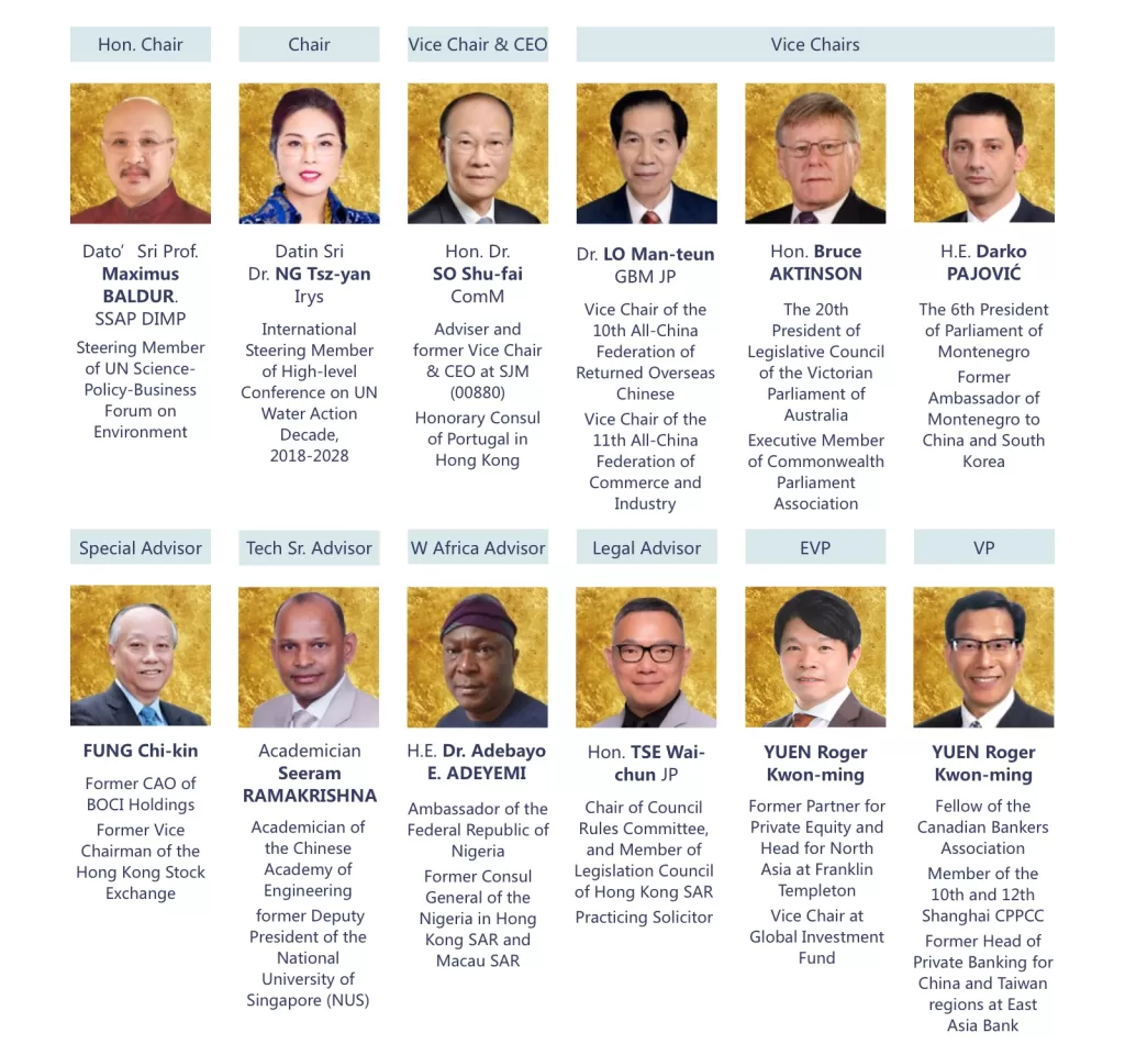 The company’s senior management team includes celebrities from all walks of life in science, business and politics: Dato’ Sri Prof. NG Tat-yung, SSAP, the inventor of the atmospheric water generation system and member of steering committee of the United Nations Science-Policy-Business Forum on Environment, serves as the honorary chairman. Datin Sri Dr. NG Tsz-yan Irys, Member of international steering committee of High-Level Conference on Water Action Decade serves as chairman. Dr. SO Shu-fai, ComM, Director & corporate advisor and former Vice Chairman & CEO of SJM Holdings (00880) serves as vice chairman and CEO. Dr. LO Man-tuen, GBM, JP, Vice Chairman of 10th All-China Federation of Returned Overseas Chinese and the Chairman of China Peaceful Development General Summit of Hong Kong Macao Taiwan Diaspora Company Limited (HK), and Hon. Bruce ATKINSON former President of Legislative Council of Victorian Parliament in Australia serve as Vice Chairman. Fung Chi-kin, former CAO of BOCI Holdings and former Vice Chairman of the Hong Kong Stock Exchange serves as Special Advisor to the Chairman; Hon. Paul TSE Wai-chun, JP, Chairman of the Rules of Procedure Committee and member of the Hong Kong Legislative Council, and Solicitor serves as legal advisor; Victor LEE Kam-wing, Former Partner for Private Equity and Head for North Asia at Franklin Templeton, Vice Chair at Global Investment Fund; Roger YUEN Kwong-ming, Fellow of the Canadian Bankers Institute and Deputy Chairman of the Hong Kong Institute of Economists Chairman, member of the 10th to 12th Shanghai CPPCC, first Head of Citibank Shanghai Branch, and former head of China and Taiwan Private Banking Department of Hong Kong Bank of East Asia, serves as vice president.
